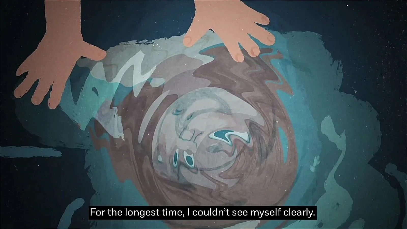 What makes this explainer video powerful is its first-person narration: "I couldn't put everything into words, but I didn't have to." Visual metaphors—swirling reflections in water and glowing line art—represent internal emotional states, trauma, and healing.